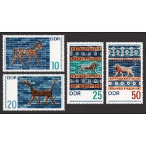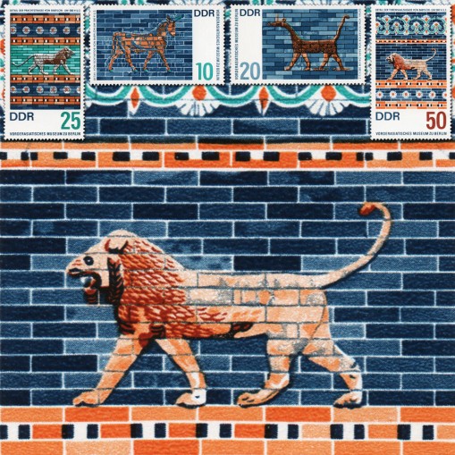 Na znaczkach widnieją fragmenty Bramy Isztar – bramy miejskiej w Babilonie wzniesionej za panowania króla Nabuchodonozora II i poświęconej bogini Isztar.