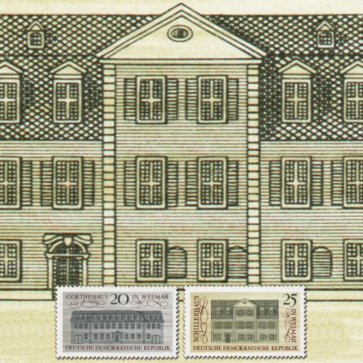 Seria, na znaczkach której widnieją weimarskie domy niemieckich pisarzy oświeceniowych: Johana Wolfganga Goethego i Friedricha Schillera.
