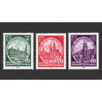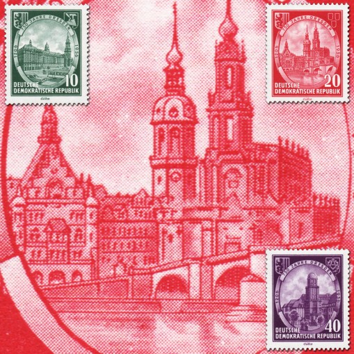 Na znaczkach widnieją kolejno: nowe budynki przy Rynku, most na Łabie i Uniwersytet Techniczny w Dreźnie.