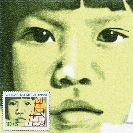 Na znaczku widnieje dziecięca twarz oraz napis „solidarność z Wietnamem”.