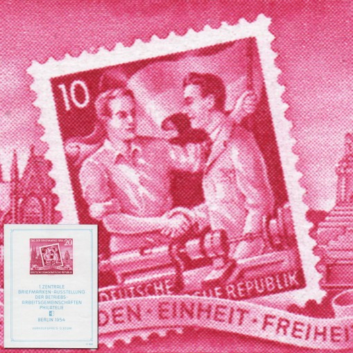Na znaczku widnieje walor obiegowy z 1953 roku przedstawiający uścisk dłoni robotników z Niemiec Wschodnich i Zachodnich, a także katedra w Kolonii i pomnik w Lipsku.