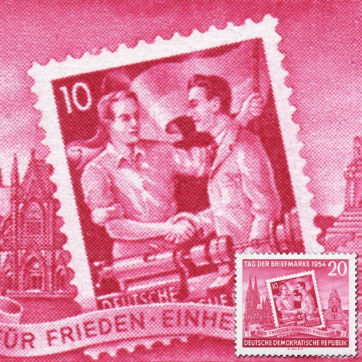 Na znaczku widnieje walor obiegowy z 1953 roku przedstawiający uścisk dłoni robotników z Niemiec Wschodnich i Zachodnich, a także katedra w Kolonii i pomnik w Lipsku.