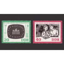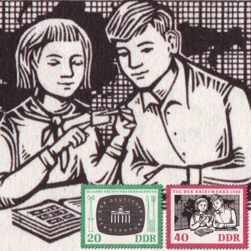 Na znaczkach widnieje ekran telewizora i młodzi filateliści.