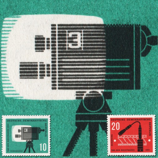Na znaczkach widnieje kamera telewizyjna oraz mikrofon studyjny.