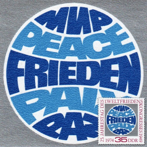 Na znaczku widnieje kula ziemska i słowo ‘pokój’ w pięciu językach.