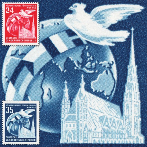 Na znaczkach widnieje kula ziemska i flagi oraz wiedeńska katedra świętego Szczepana.