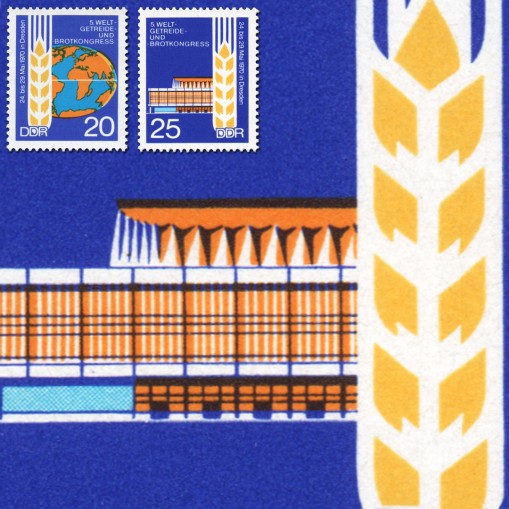Na znaczkach widnieją kłosy zboża, kula ziemska i Pałac Kultury w Dreźnie.