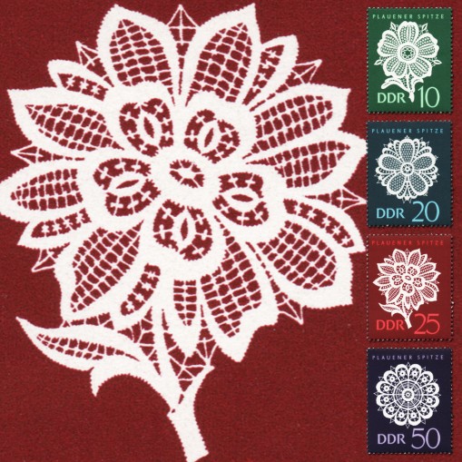 Seria, na znaczkach której widnieją przykłady koronki z Plauen - miasta, które swój rozkwit w XV wieku zawdzięcza tkaczom i sukiennikom. Pod koniec XIX wieku na rynek weszły haftowane tutaj maszynowo koronki, które zdobyły uznanie na całym świecie. Szybko przybywało zakładów produkcyjnych, a w ciągu zaledwie kilku lat liczba mieszkańców Plauen podwoiła się do ponad stu tysięcy.