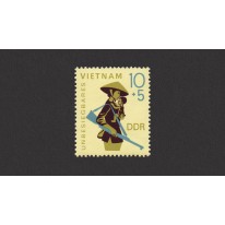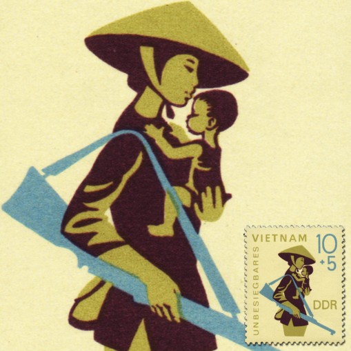 Na znaczku widnieje matka z dzieckiem i z karabinem oraz napis „niezwyciężony Wietnam”.