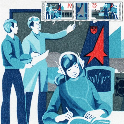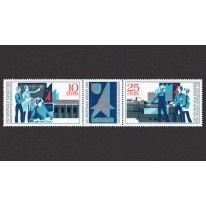 Na znaczkach widnieją uczniowie i praktykanci przy maszynie do spawania.