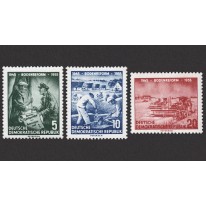 Na znaczkach widnieją rolnicy i dokument reformy, murarze budujący nowe osiedle oraz kombajn w polu.