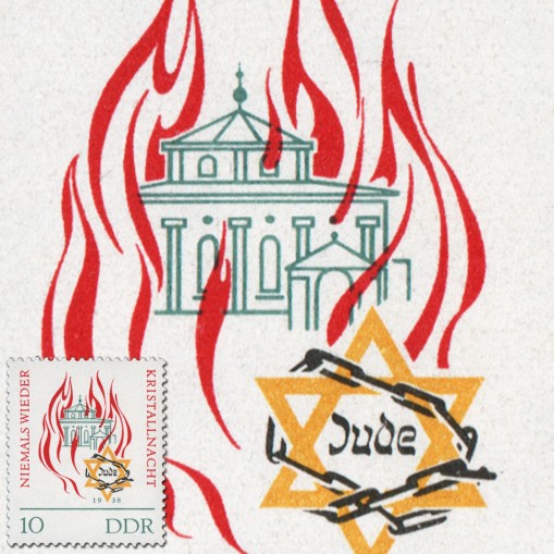 Znaczek upamiętniający 25. rocznicę nocy kryształowej - pogrom Żydów w nazistowskich Niemczech zainicjowany przez władze państwowe. Ulice niemieckich miast zostały zasypane odłamkami szkła i kryształów ze zniszczonych żydowskich mieszkań i sklepów, stąd też nazwa pogromu.