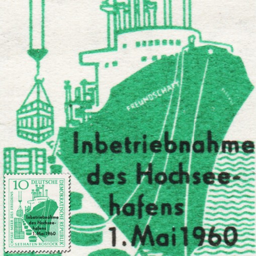 Znaczek wydany pierwotnie w 1958 roku z z okazji budowy portu Rostock, tym razem z nadrukiem upamiętniającym otwarcie portu.