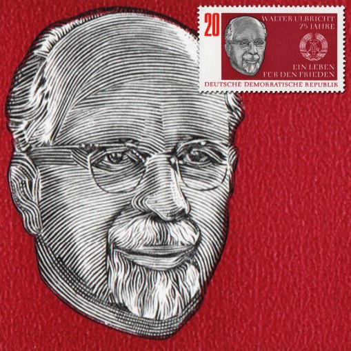 Znaczek upamiętniający 75. rocznicę urodzin Waltera Ulbrichta, niemieckiego polityka komunistycznego, przewodniczącego rady państwa Niemieckiej Republiki Demokratycznej, I sekretarza Socjalistycznej Partii Jedności Niemiec (SED) w latach 1950-1971.