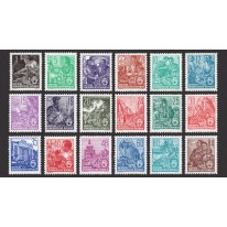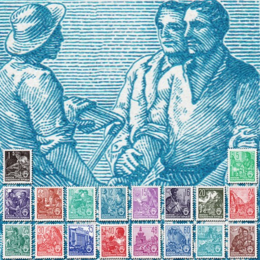 Na znaczkach widnieją robotnicy pracujący w różnych gałęziach przemysłu.