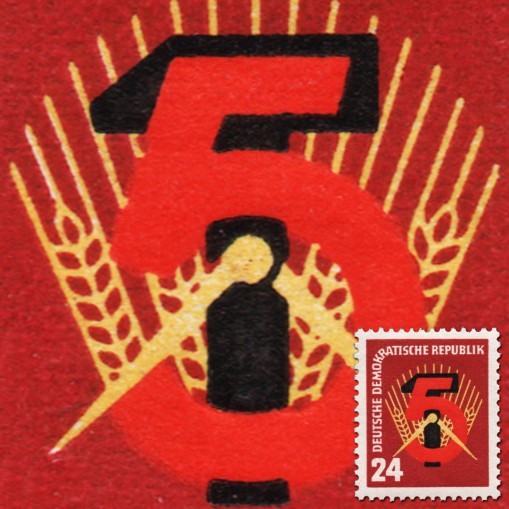Na znaczku widnieją symbole planu: liczba 5, młot, cyrkiel i kłosy zboża.