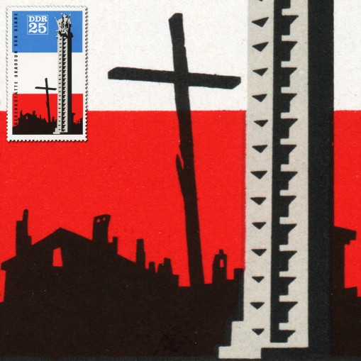 Znaczek upamiętniający masakrę w Oradour-sur-Glane, gdzie oddział niemieckich wojsk Waffen-SS wymordował niemal całą ludność miasteczka, w odwecie za zabicie przez członków francuskiego ruchu oporu oficera SS Helmuta Kämpfe. Zamordowano 642 osoby – mężczyzn, kobiety i dzieci. W odwecie spacyfikowano pomyłkowo nie tę miejscowość – oficera SS pojmał i zabił ruch oporu z Oradour-sur-Vayres.