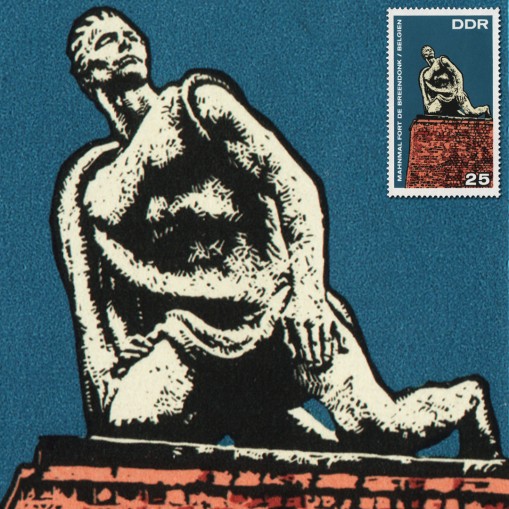 Znaczek, na którym widnieje pomnik ofiar leżącego na trenie Belgii obozu koncentracyjnego Fort Breendonk.