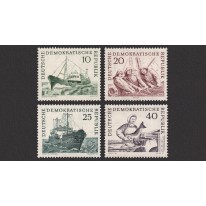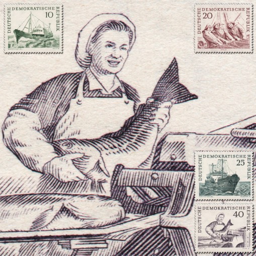 Na znaczkach widnieją kolejno: trawler, rybacy wyciągający sieć, statek „Robert Koch” i pracownica przetwórni ryb.