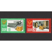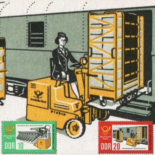 Na znaczkach widnieje maszyna sortująca listy i załadunek przesyłek do pociągu przy użyciu wózka widłowego.