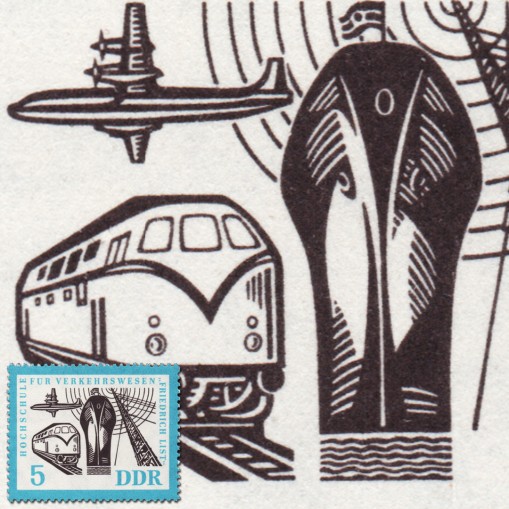 Znaczek upamiętniający 10-lecie wyższej szkoły transportu w Dreźnie.