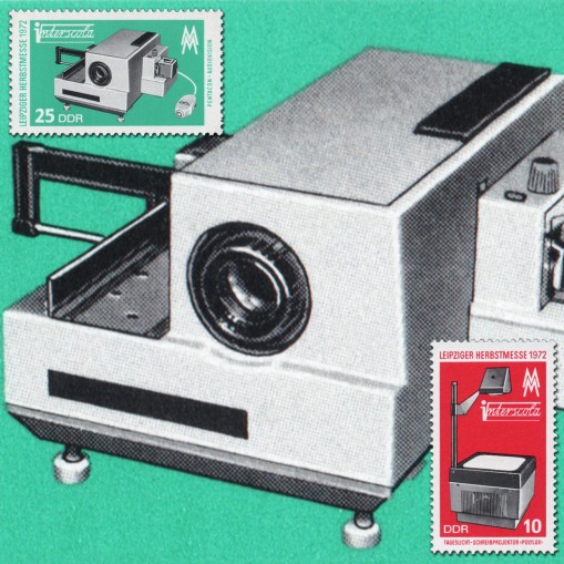 Na znaczkach widnieje rzutnik i projektor do slajdów Aspectomat J24B.