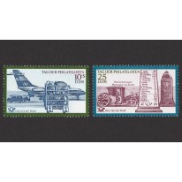 Na znaczkach widnieją środki transportu poczty: samolot Tupolew Tu-134 oraz dyliżans pocztowy wraz z XVIII-wiecznymi pocztowymi słupami milowymi.