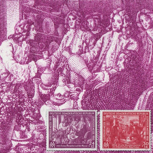 Na znaczkach widnieje pierwsza prezentacja porcelany na targach w 1710 roku oraz pierwsze targi w miejskim domu towarowym (niem. Städtische Kaufhaus) w 1894 roku.
