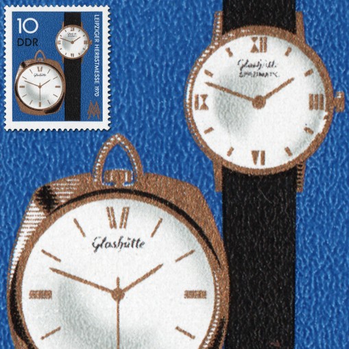 Na znaczku widnieją zegarek kieszonkowy i zegarek na rękę.