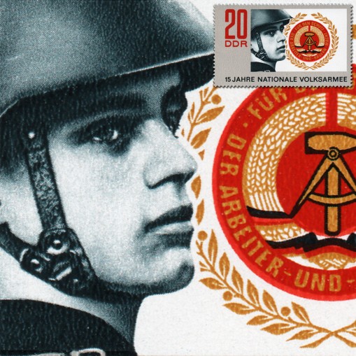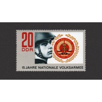 Znaczek upamiętniający 15-lecie Nationale Volksarmee (pol. Narodowej Armii Ludowej), sił zbrojnych Niemieckiej Republiki Demokratycznej.