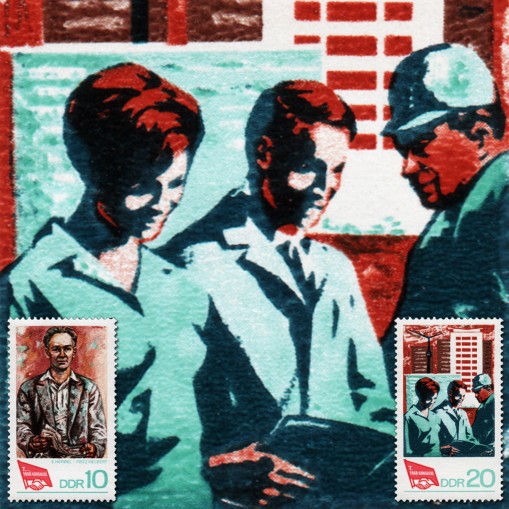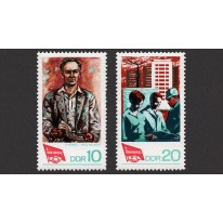 Na znaczkach widnieje polityk Fritz Heckert i budowa nowych mieszkań.