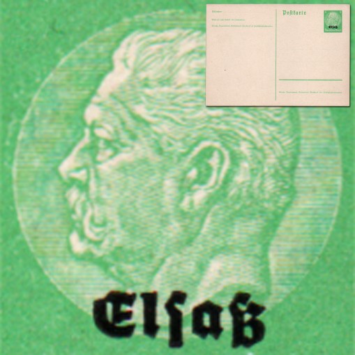 Kartka pocztowa z nadrukowanym znaczkiem wydana uprzednio w Rzeszy Niemieckiej w 1933 roku, tym razem z nadrukiem „Elsaß”, przeznaczona do użytku w okupowanej Alzacji.