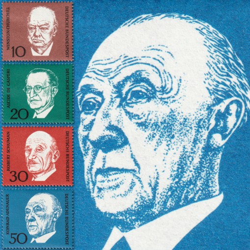 Oprócz Adenauera na znaczkach widnieją: Sir Winston Churchill, Alcide de Gasperei i Robert Schuman.