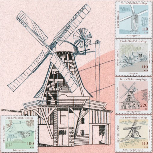 Na znaczkach widnieją rożne rodzaje tradycyjnych młynów wodnych i wiatrowych, kolejno: