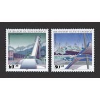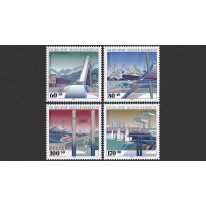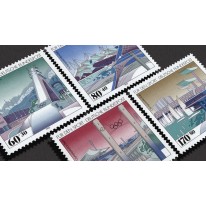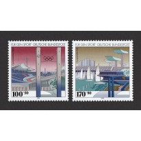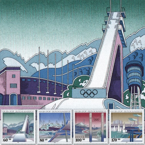 Na znaczkach widnieją olimpijskie obiekty sportowe w Niemczech, kolejno: