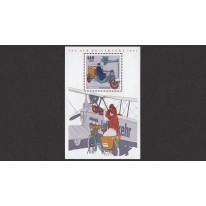 Znaczek w bloku wydany na Dzień Znaczka. Na znaczku widnieje transport poczty trzykołowym motorem i wczesnym samolotem.