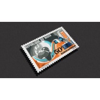 Na znaczku widnieje mapa obu kontynentów oraz symbole rolnictwa i przemysłu.