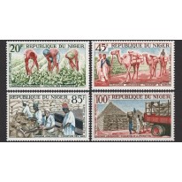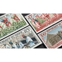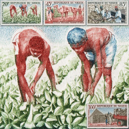 Na znaczkach widnieją kolejne etapy tego procesu: praca na plantacji, transport na grzbiecie wielbłądów, pakowanie i transport ciężarówkami.