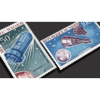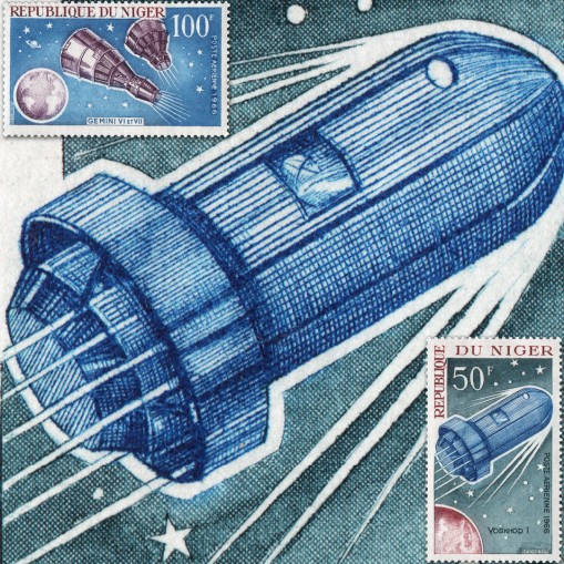Na znaczkach widnieją statki kosmiczne: radziecki „Woschod 1” i amerykańskie „Gemini 6” i „Gemini 7”.