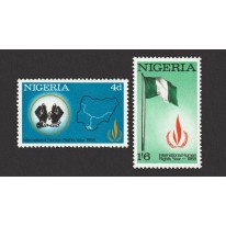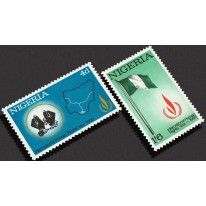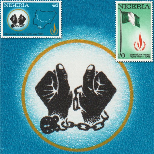 Na znaczkach przedstawiono czarne ręce rozrywające kajdany, kontur mapy Nigerii oraz flagę Nigerii.