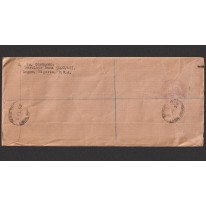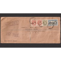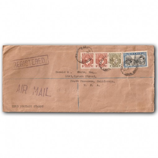 List polecony poczty lotniczej ze znaczkami obiegowymi wydanymi w latach 1950-1951 i przedstawiającymi króla Jerzego VI oraz (ostatni znaczek) drogę pomiędzy Victoria i Buea.