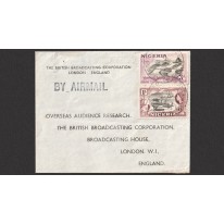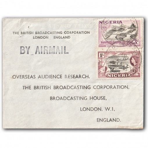 List polecony poczty lotniczej ze znaczkami obiegowymi wydanymi w 1953 roku, na których widnieją: spławianie drewna i most Jabba na Nigrze.