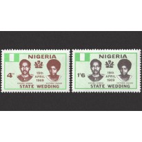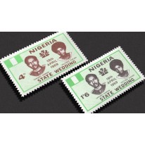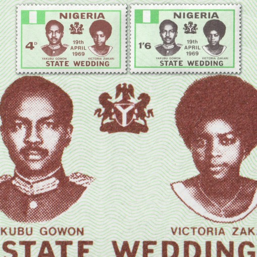Znaczki upamiętniające ślub prezydenta Nigerii nazwiskiem Yakubu Gowon.