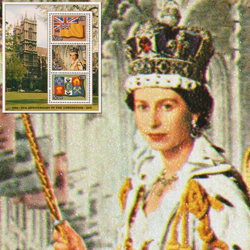 Na znaczkach widnieją kolejno: flagi Wielkiej Brytanii i Niue, monarchini w szatach koronacyjnych oraz sztandar Elżbiety II dla Nowej Zelandii.