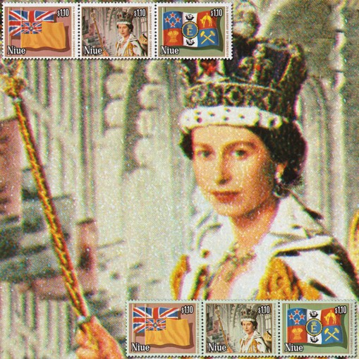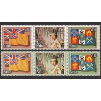Na znaczkach widnieją kolejno: flagi Wielkiej Brytanii i Niue, monarchini w szatach koronacyjnych oraz sztandar Elżbiety II dla Nowej Zelandii.