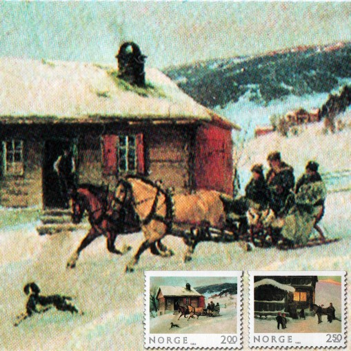 Na znaczku widnieją obrazy Axela Endera („Przejażdżka saniami”) i Gustava Wentzela („Przybycie gości”).