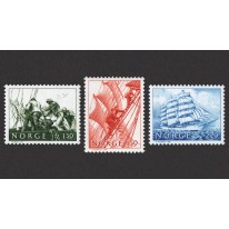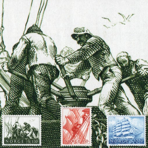 Na znaczkach widnieją marynarze podnoszący kotwicę i rozwijający żagle, a także żaglowiec „Christian Radich”.