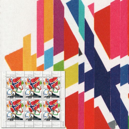 Na znaczkach widnieją flagi, pierścienie olimpijskie i budynki w Lillehammer.