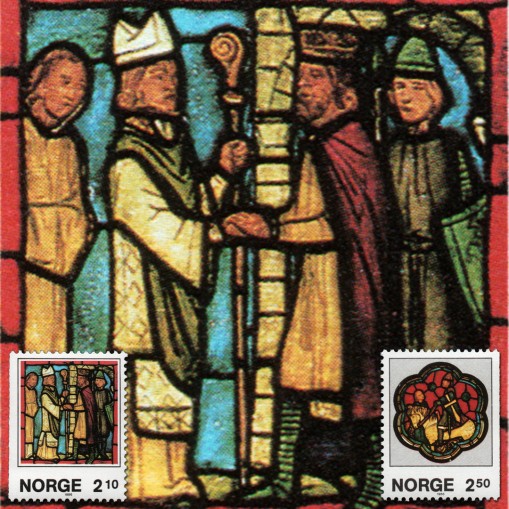 Na znaczkach widnieją witraże z katedry w Trondheim przedstawiające kolejno króla Olafa III Pokojowego ustanawiającego biskupstwo w Nidaros (dzisiejszym Trondheim) oraz króla i chłopa w Sul.