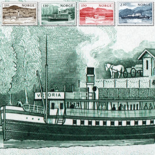 Na znaczkach widnieją parowce i statki motorowe na jeziorze Mjøsa, na kanale Bandak, na jeziorze Femund i jeziorze Tinnsjøen.